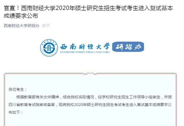 以上就是有关“2020考研分数线:西南财经大学2020年硕士研究生复试基本分数线公布!”的全部内容了,进入复试的同学一定要好好准备,在国家线徘徊的同学抓紧准备调剂了!