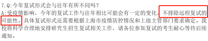 同济大学研究生处关于2020年研究生招生常见问题答疑中提到,不排除远程复试的可能性。