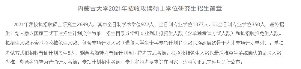 以上就是“考研院校公告:内蒙古大学2021年与2020年考研招生人数信息变动解析”的全部内容,想了解更多考研信息,请多多关注我们!