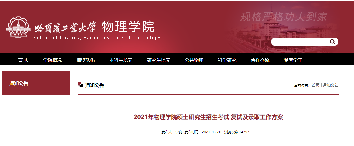 “哈尔滨工业大学2021年物理学院硕士研究生招生考试复试及录取工作方案”,其中,就2021考研复试时间和复试方式等内容做了详细说明,原文内容如下: