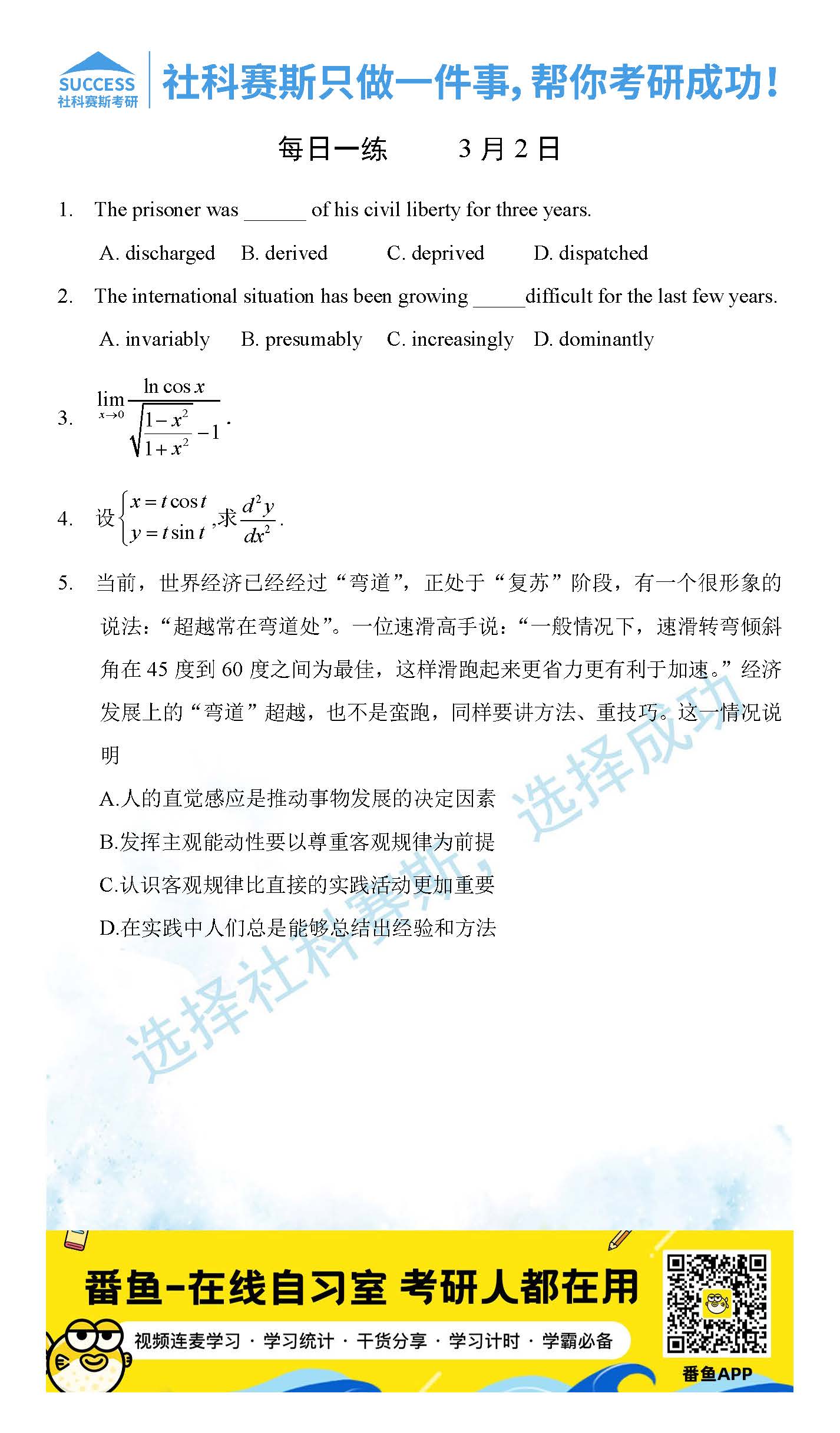 考研是一场持久战,保持良好的学习习惯,是能确保复习高效的关键。今天社科赛斯考研网小编整理了“2022考研每日一练:3月2日每日一练及答案”的内容,希望能对广大考生有所帮助。