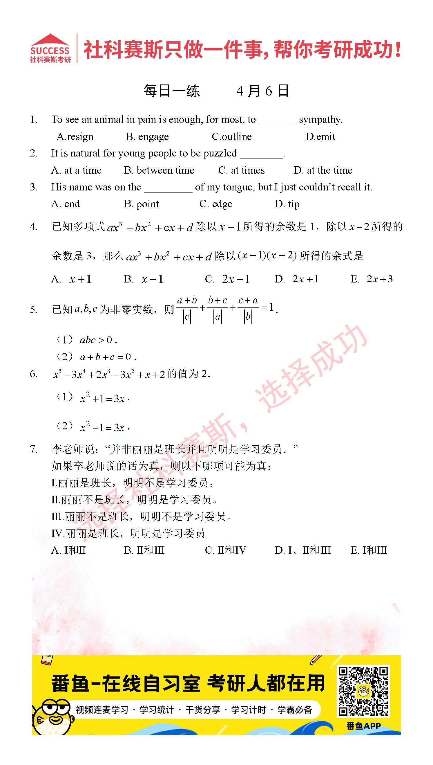 以上就是社科赛斯考研网小编为大家整理2022考研每日一练:4月6日管理类联考每日一练及答案的全部内容,希望各位考生坚持利用起来,更多每日一练内容请持续关注社科赛斯考研网