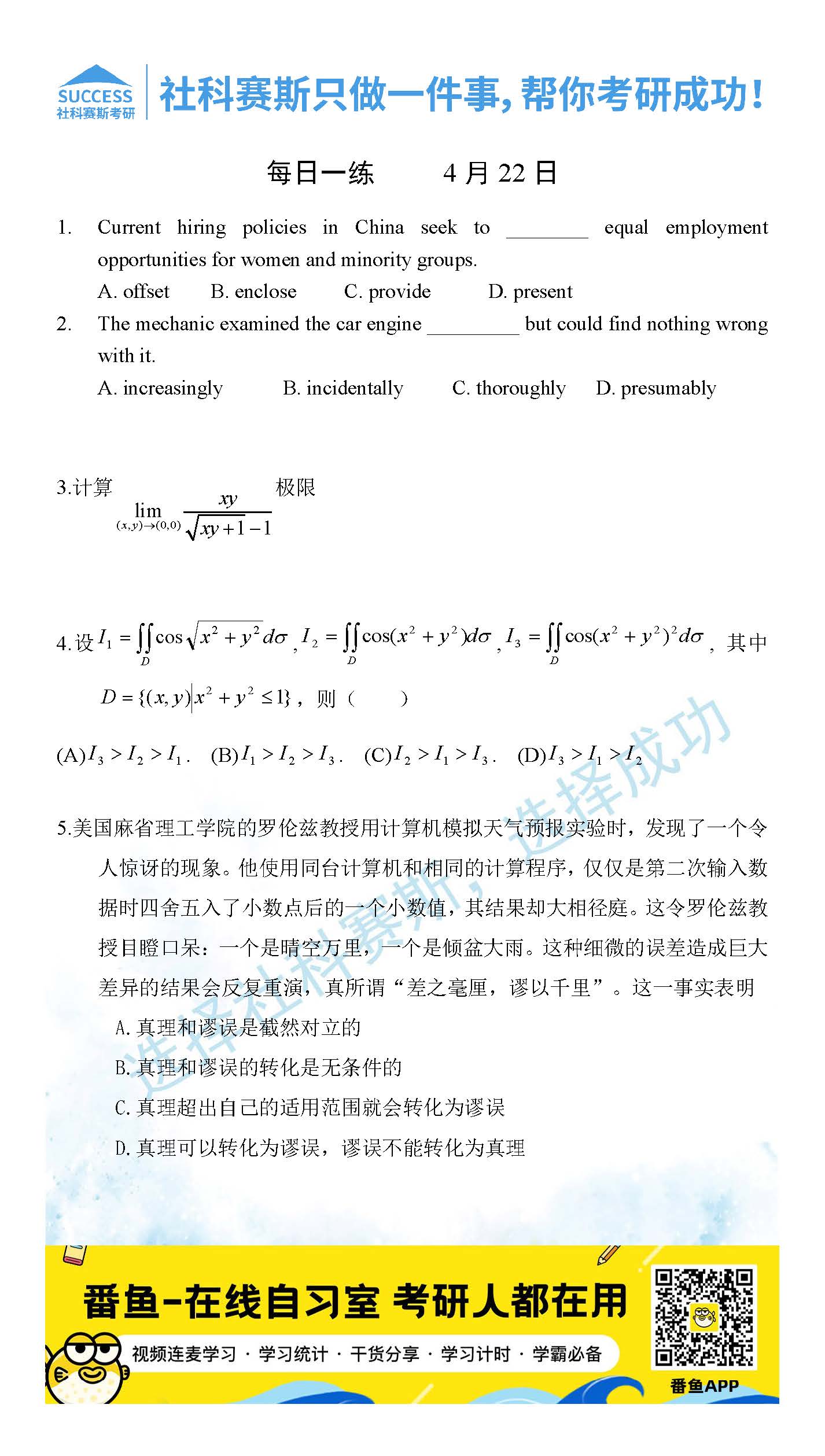 考研是一场持久战,保持良好的学习习惯,是能确保复习高效的关键。今天社科赛斯考研网小编整理了“2022考研每日一练:4月22管理类联考每日一练及答案”的内容,希望能对广大考生有所帮助。