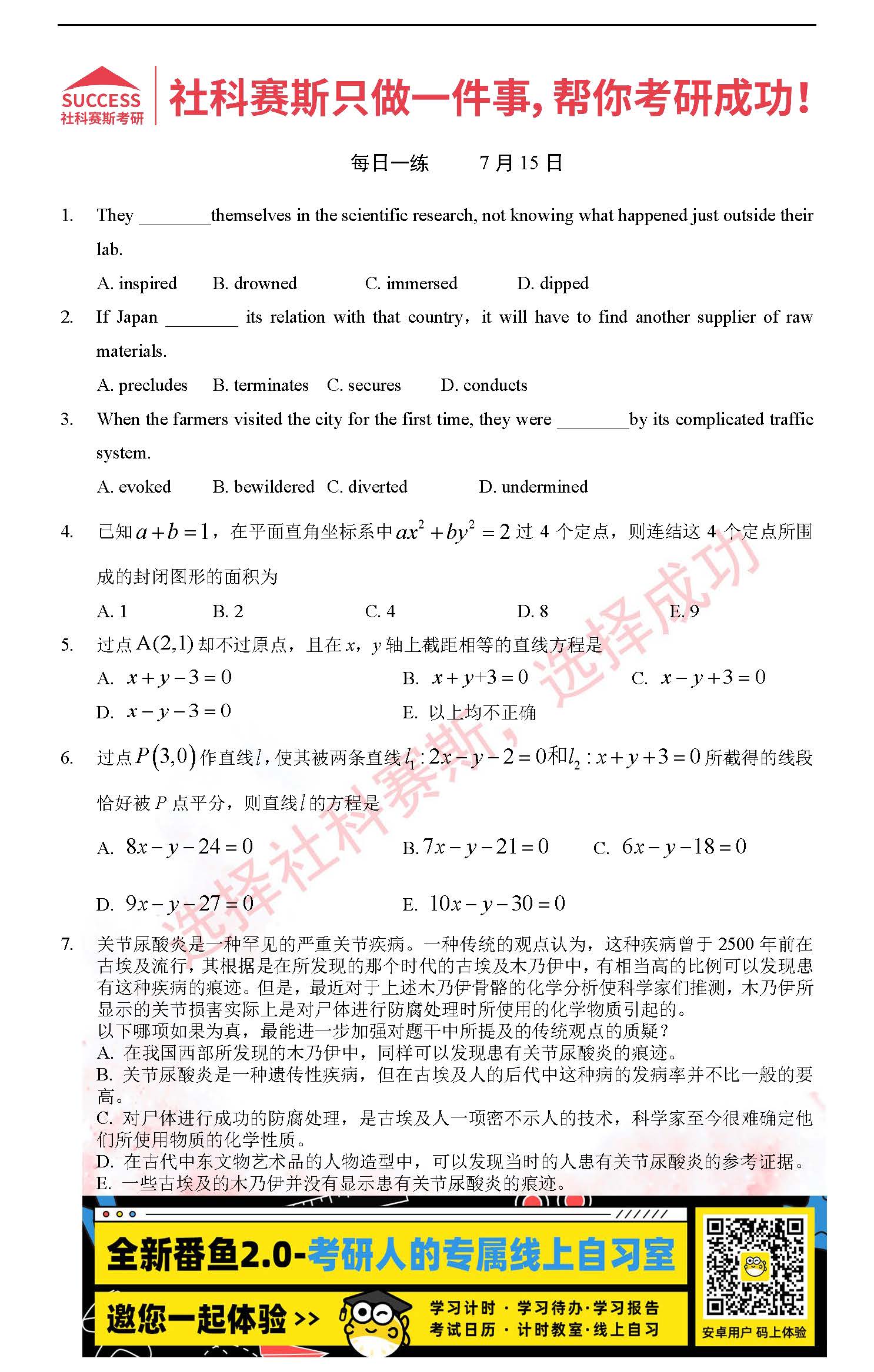 以上就是社科赛斯考研网小编为大家整理2022考研每日一练:7月15日管理类联考每日一练及答案的全部内容,希望各位考生坚持利用起来,更多每日一练内容请持续关注社科赛斯考研网