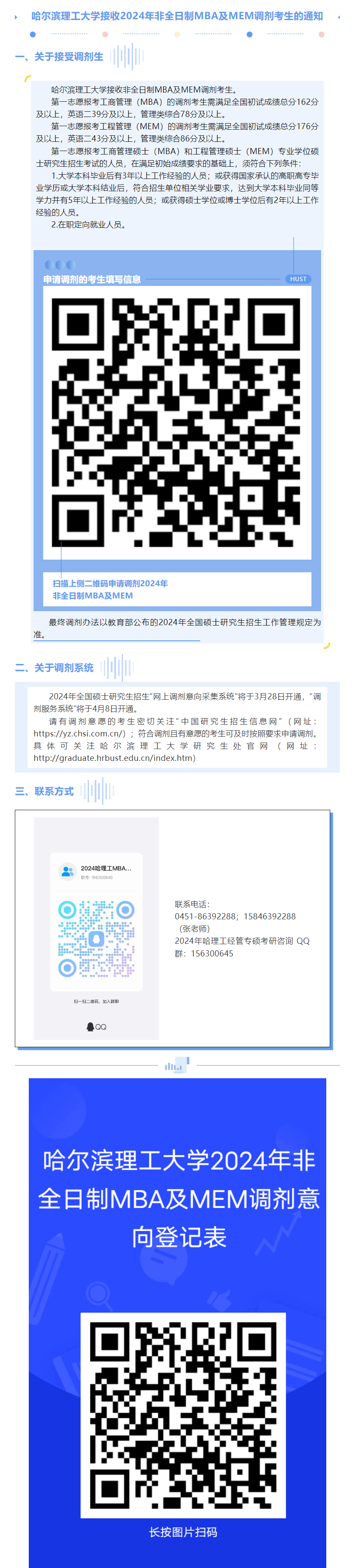 以上就是小编整理“2024考研调剂:哈尔滨理工大学接收2024年非全日制MBA及MEM调剂考生的通知”的全部内容,想了解更多调剂信息,请持续关注本网站。