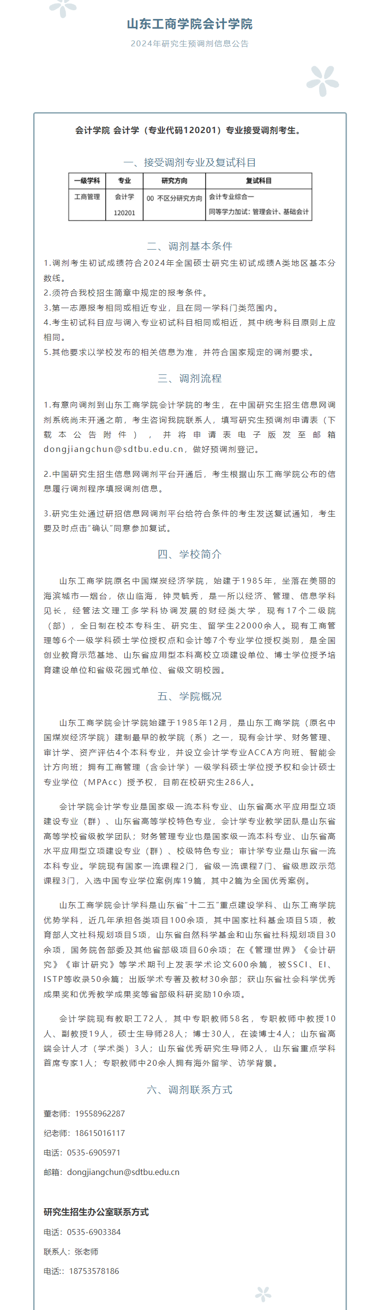 以上就是小编整理“2024考研预调剂:山东工商学院会计学院2024年研究生预调剂信息公告”的全部内容,想了解更多调剂信息,请持续关注本网站。