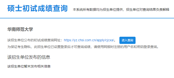 华南师范大学考研初试成绩查询入口:https://yz.chsi.com.cn/apply/cjcxa/