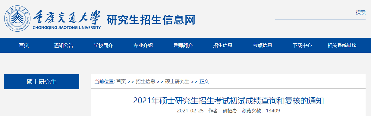 以上就是小编整理“2021考研初试成绩:重庆交通大学考研初试成绩查询入口开启!初试成绩已公布!”的全部内容,想了解更多相关信息请持续关注本网站。
