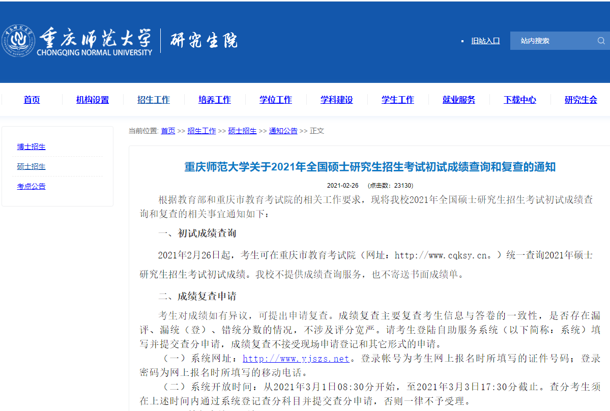 以上就是小编整理“2021考研初试成绩:重庆师范大学考研初试成绩查询入口开启!初试成绩已公布!”的全部内容,想了解更多相关信息请持续关注本网站。