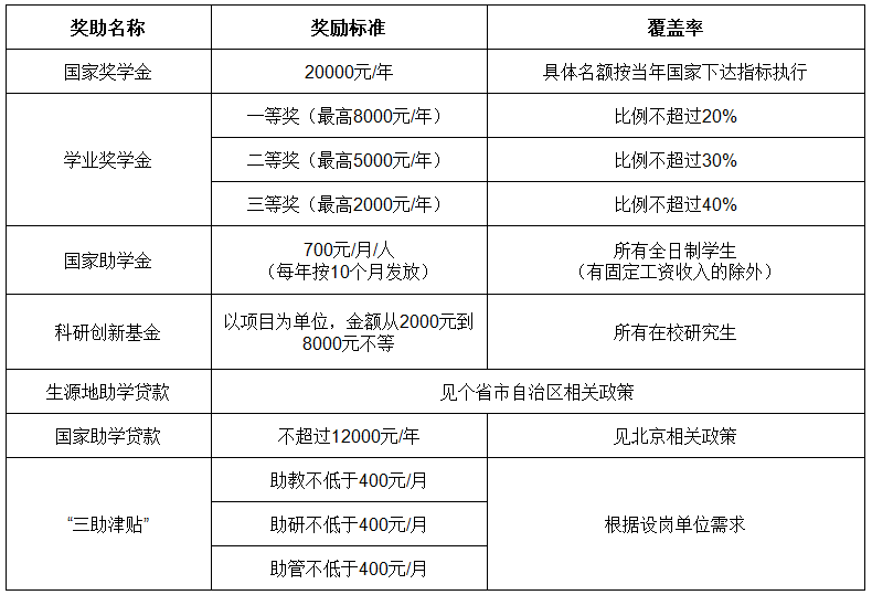 2. 根据北京市财政局、北京市教育委员会制定的《北京市研究生国家奖学金、学业奖学金、国家助学金管理暂行办法》(京财教育〔2013〕2199号),我校面向全日制研究生设置有国家奖学金、学业奖学金和助学金,国家奖学金和学业奖学金按照奖学金评选办法进行评选,助学金面向非定向就业学生。同时,学院设置研究生“三助”岗位,为研究生提供勤工助学机会。