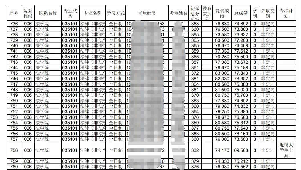 法律(非法学):全日制录取69人,最高分397分,最低分356分;